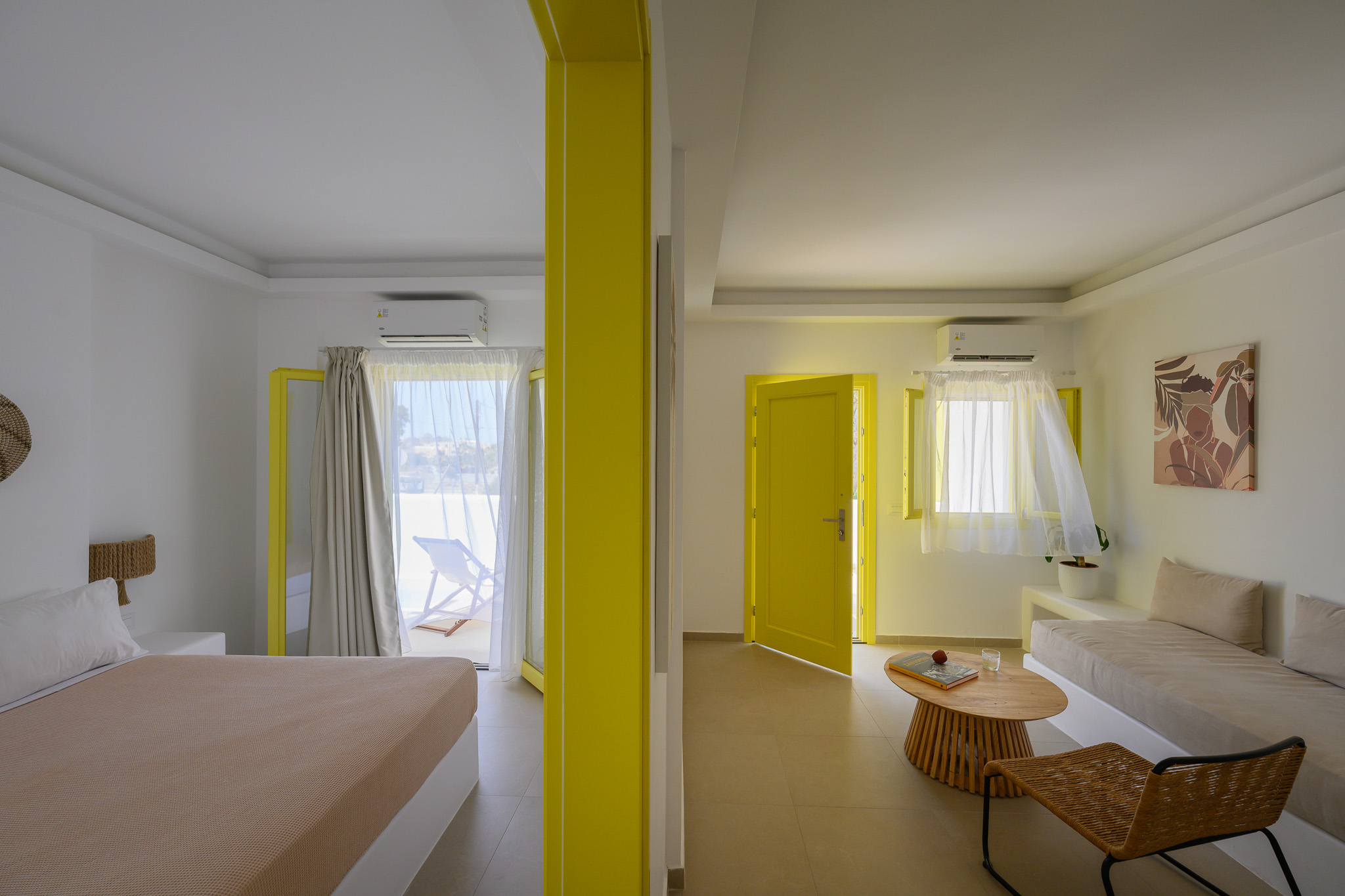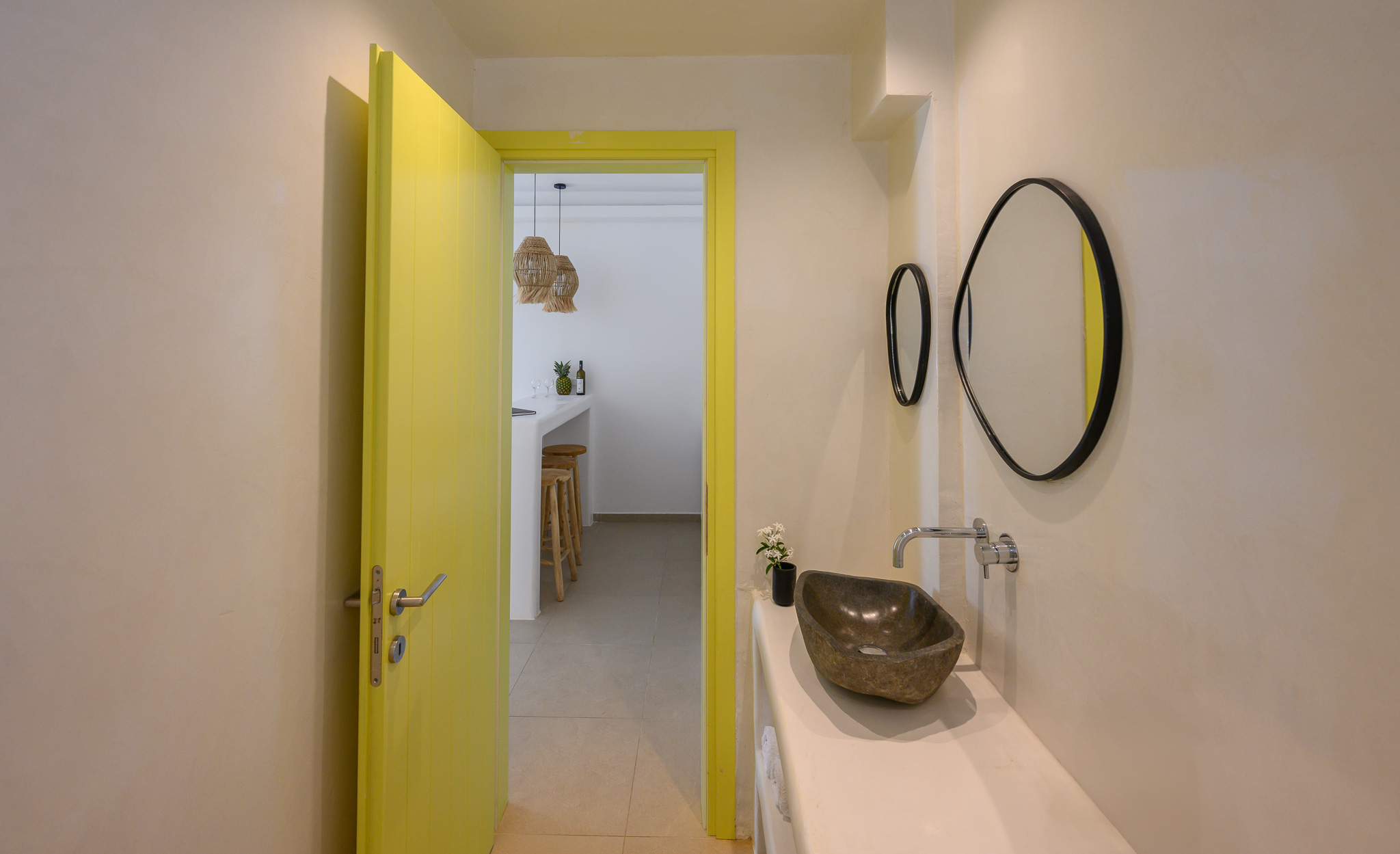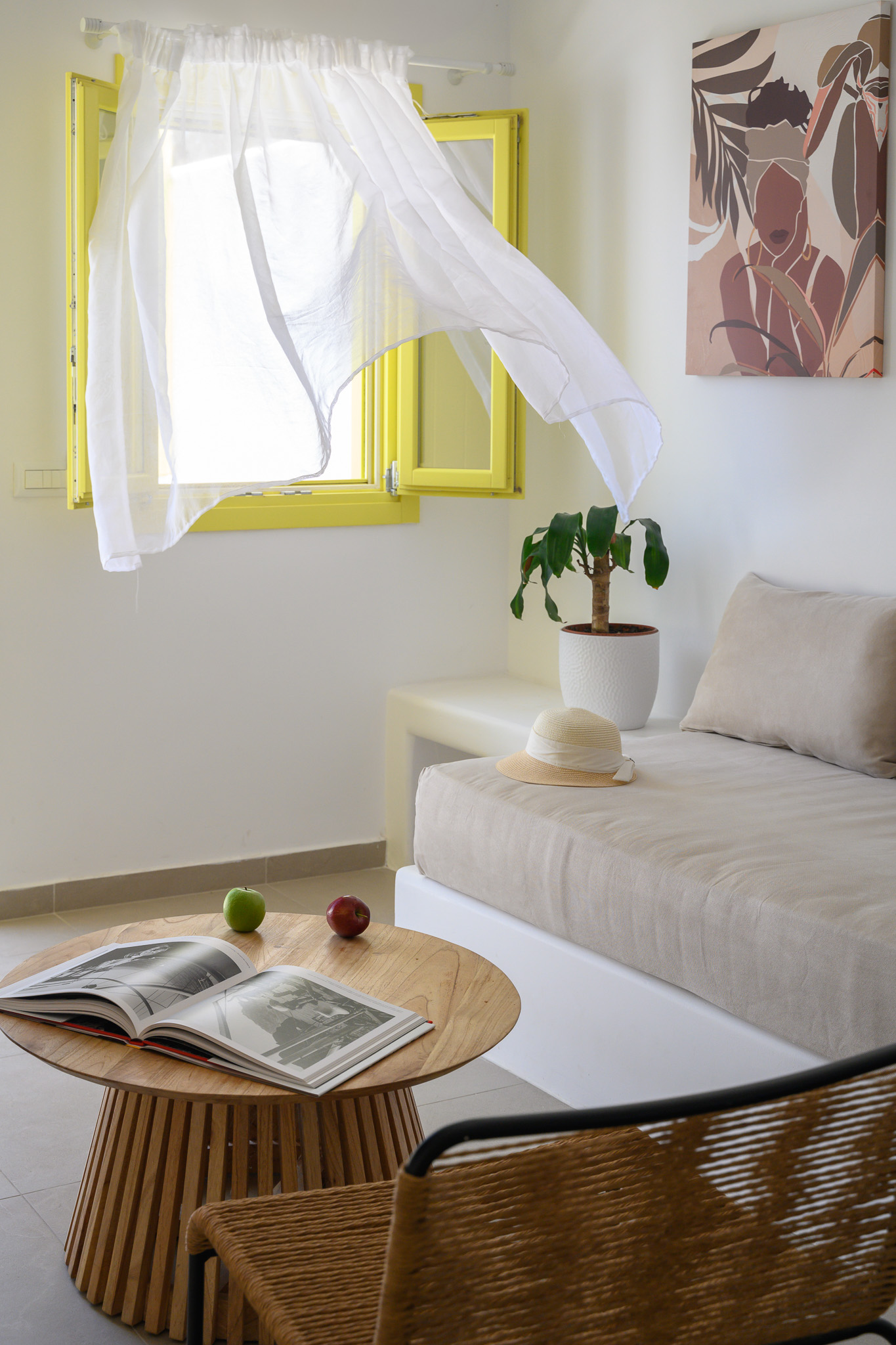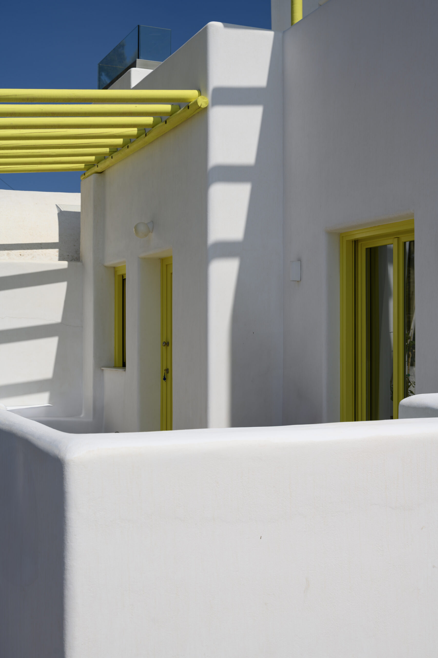 Inspired by conscious living yet elevated through thoughtful design, the residence blends traditional Cycladic architecture with refined earthy tones, natural textures, and warm yellow accents that reflect light, vitality, and understated luxury. The minimal aesthetic is intentional and calm, allowing space, light, and materials to speak — creating an atmosphere that feels expansive, balanced, and quietly indulgent.
