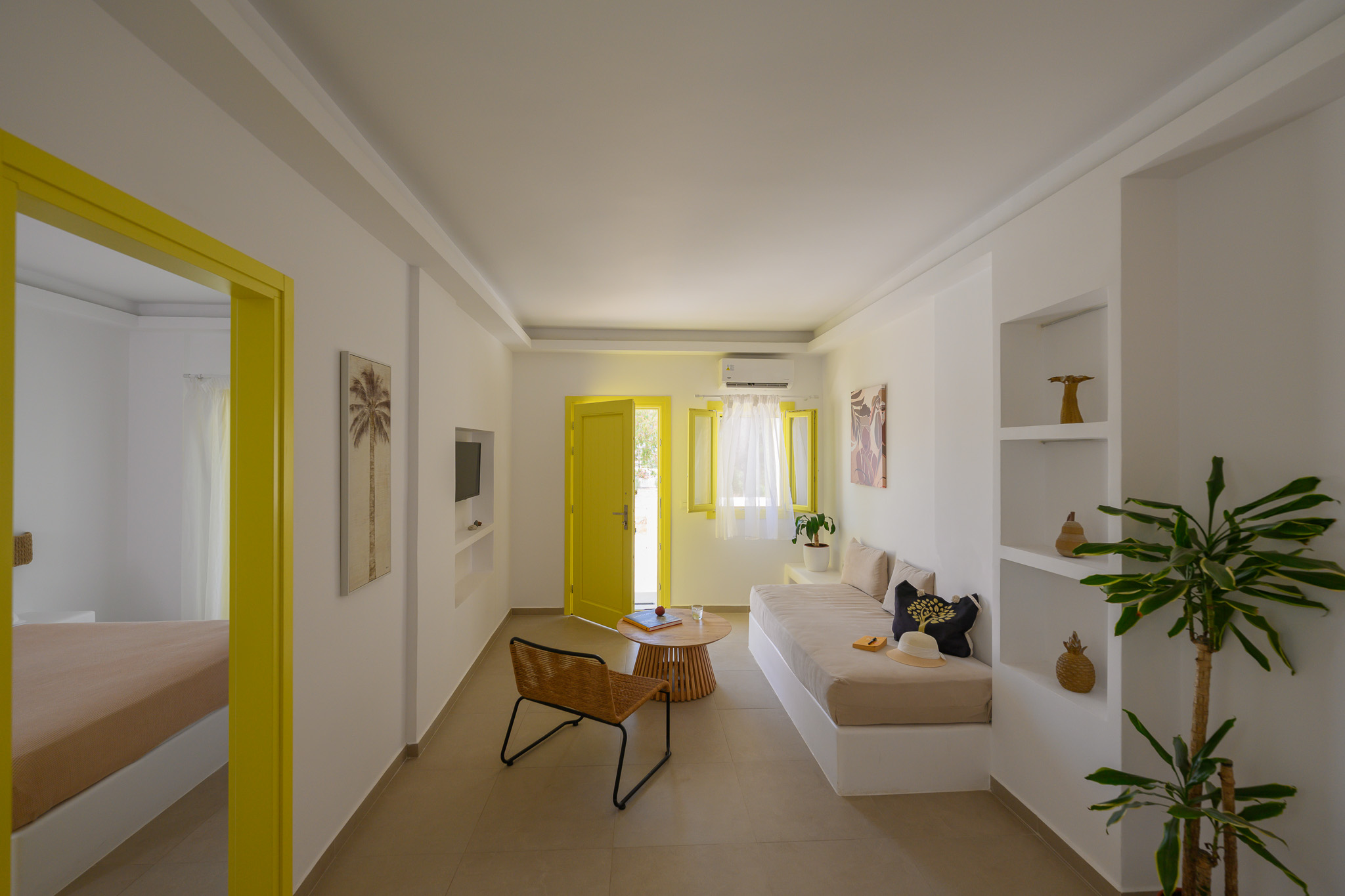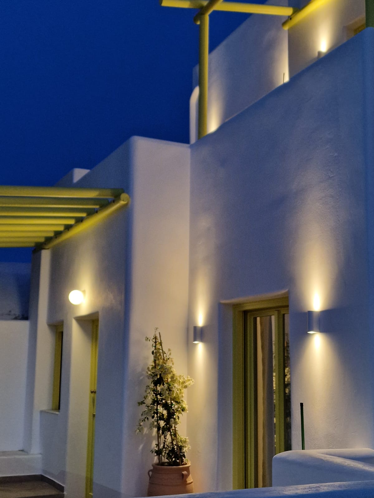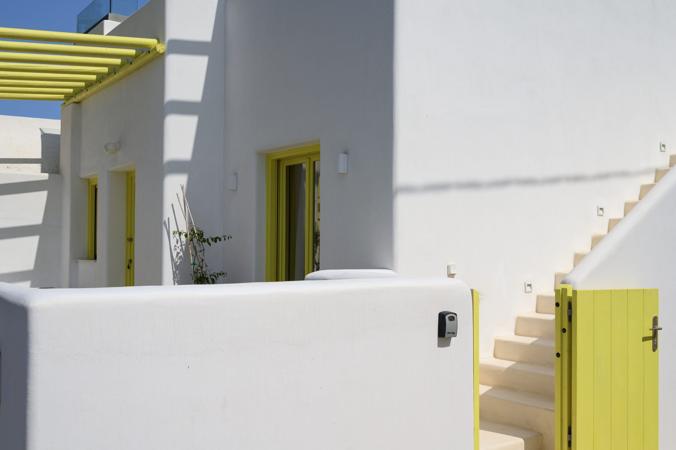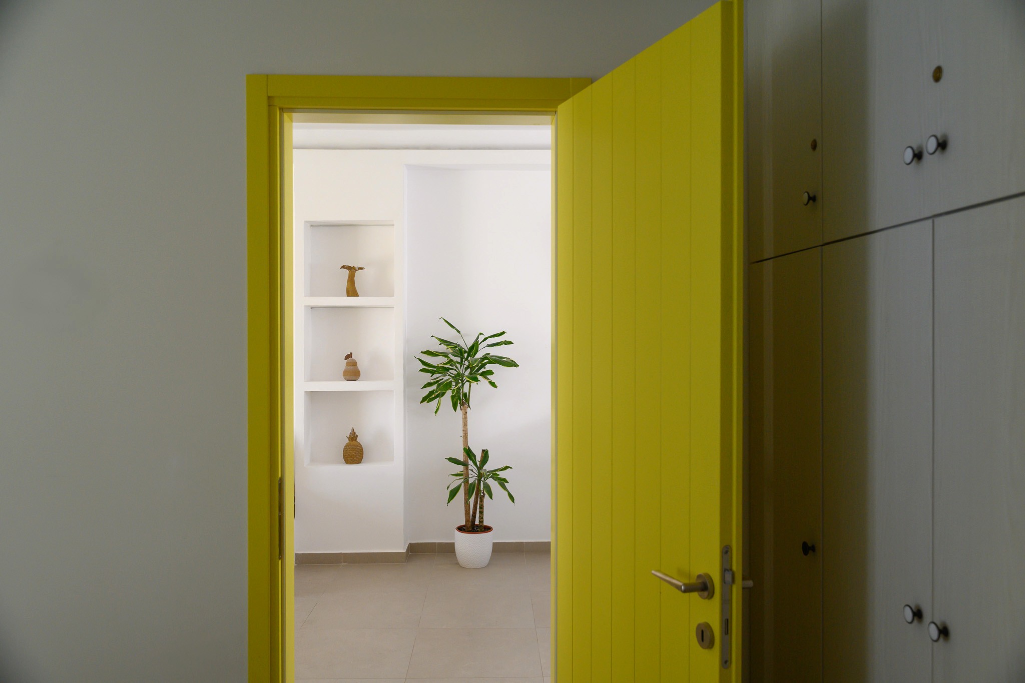 Inspired by conscious living yet elevated through thoughtful design, the residence blends traditional Cycladic architecture with refined earthy tones, natural textures, and warm yellow accents that reflect light, vitality, and understated luxury. The minimal aesthetic is intentional and calm, allowing space, light, and materials to speak — creating an atmosphere that feels expansive, balanced, and quietly indulgent.