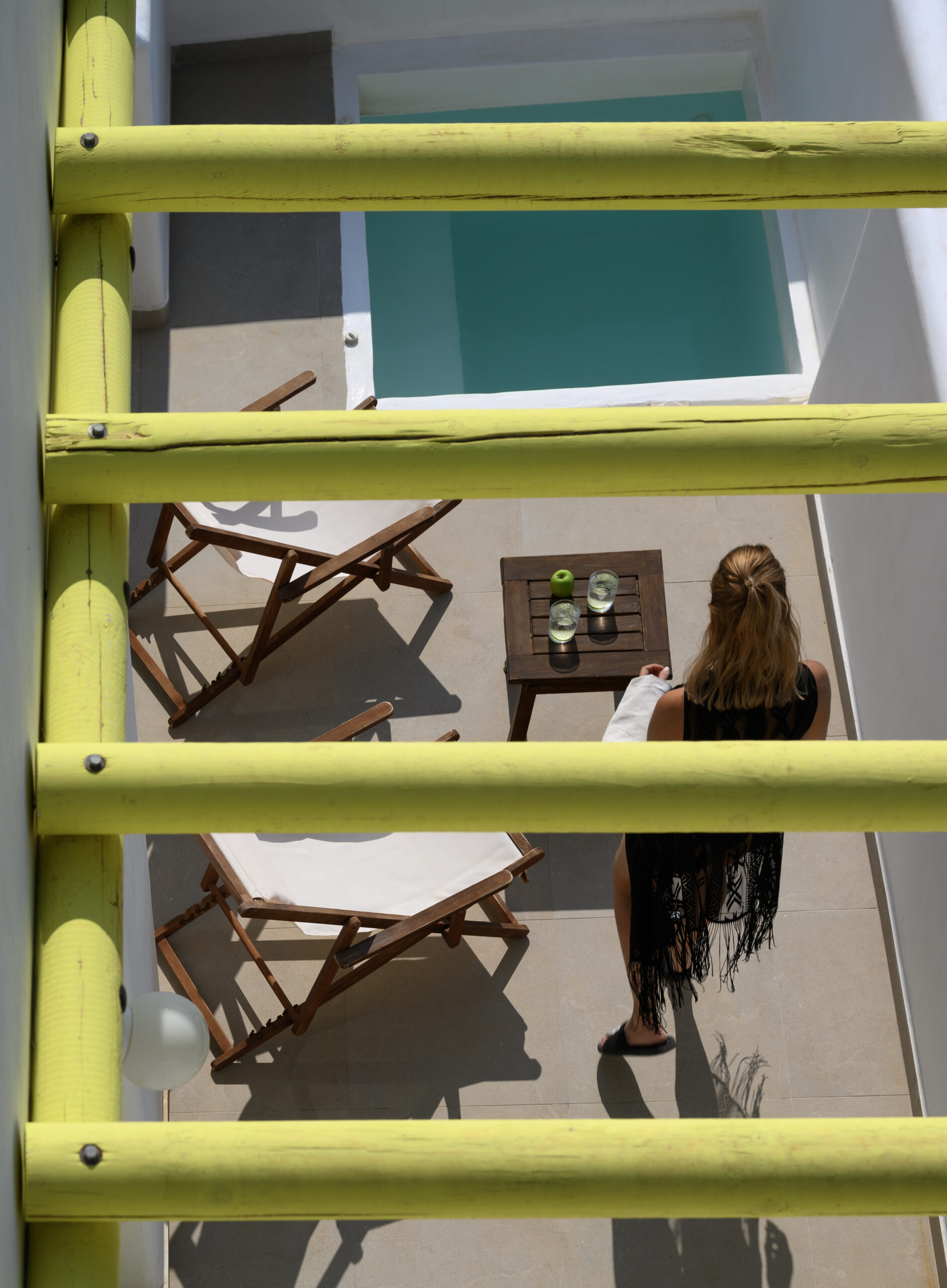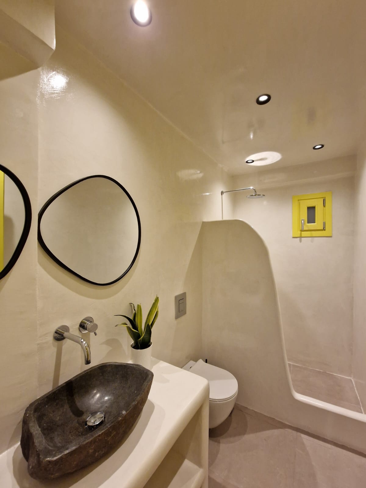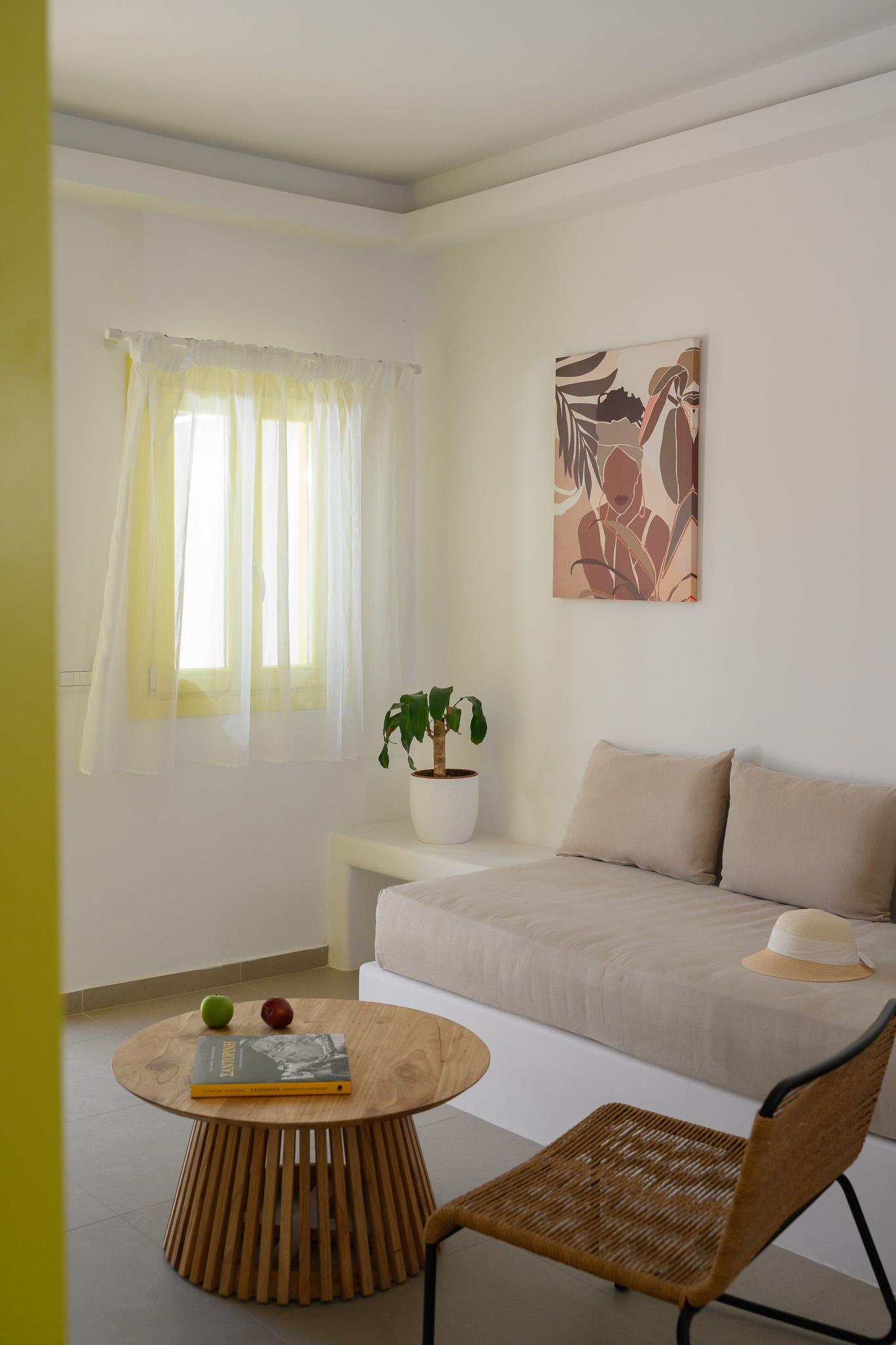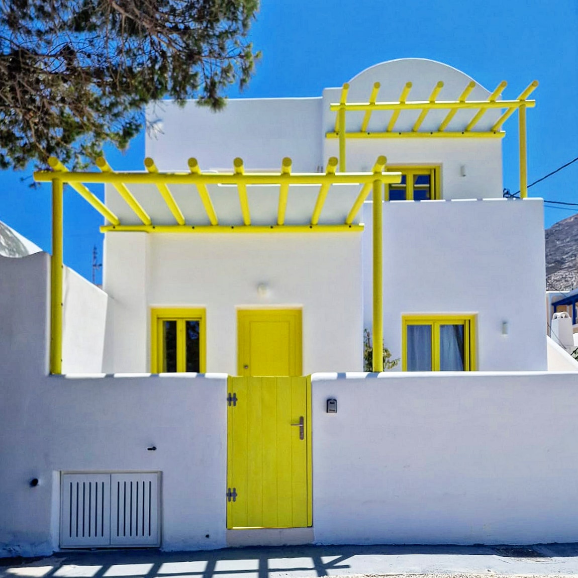 Inspired by conscious living yet elevated through thoughtful design, the residence blends traditional Cycladic architecture with refined earthy tones, natural textures, and warm yellow accents that reflect light, vitality, and understated luxury. The minimal aesthetic is intentional and calm, allowing space, light, and materials to speak — creating an atmosphere that feels expansive, balanced, and quietly indulgent.