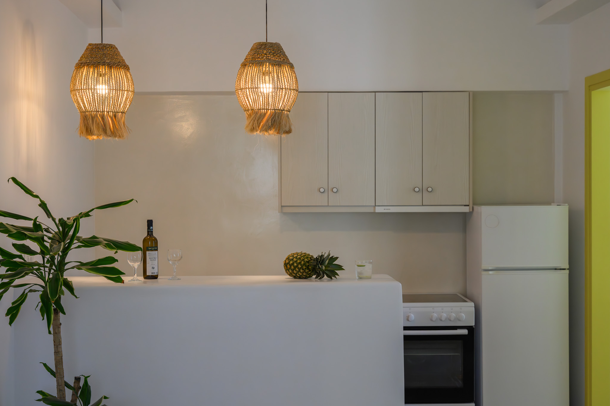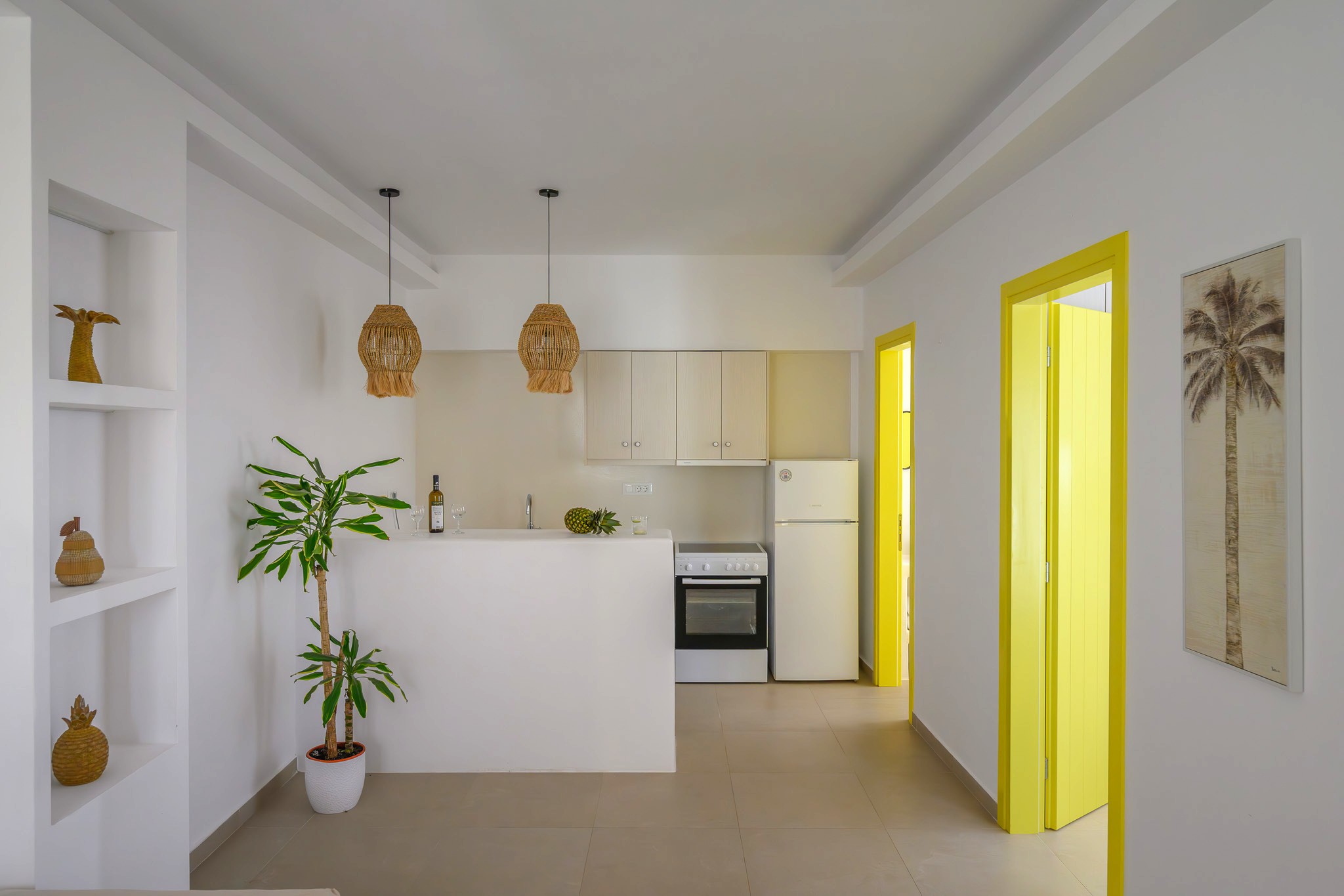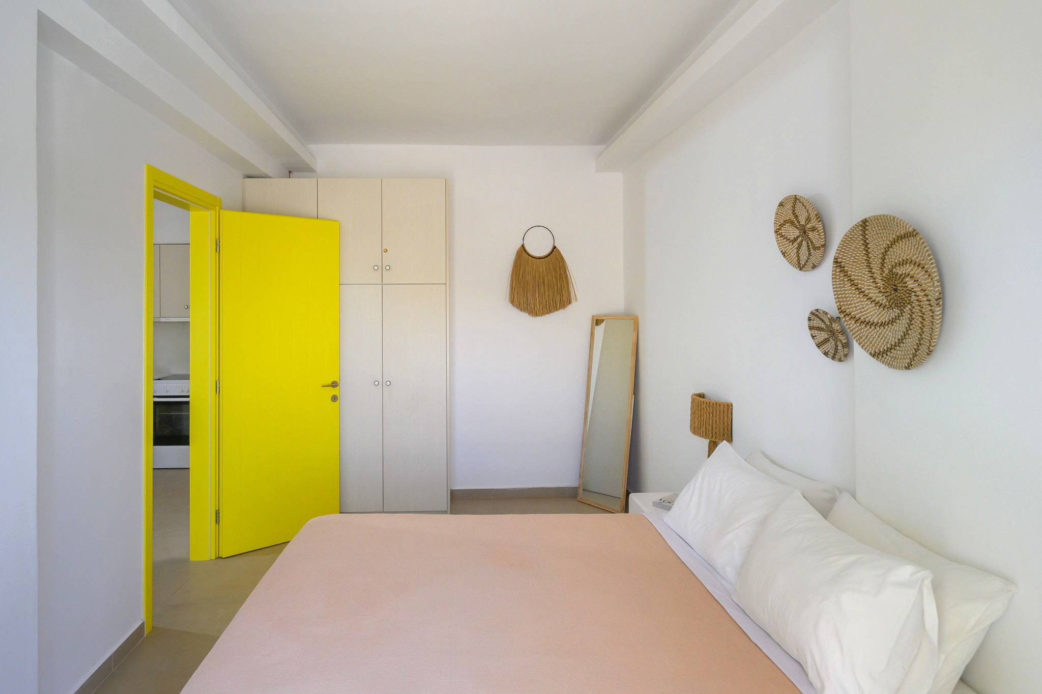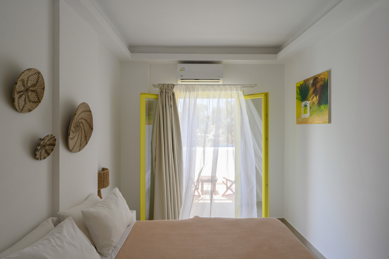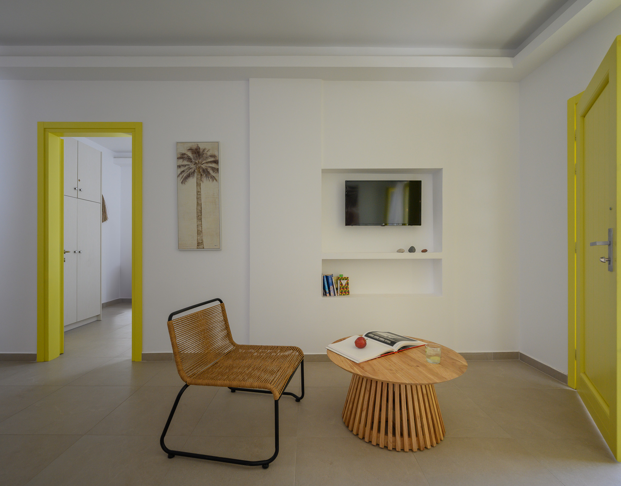 Inspired by conscious living yet elevated through thoughtful design, the residence blends traditional Cycladic architecture with refined earthy tones, natural textures, and warm yellow accents that reflect light, vitality, and understated luxury. The minimal aesthetic is intentional and calm, allowing space, light, and materials to speak — creating an atmosphere that feels expansive, balanced, and quietly indulgent.