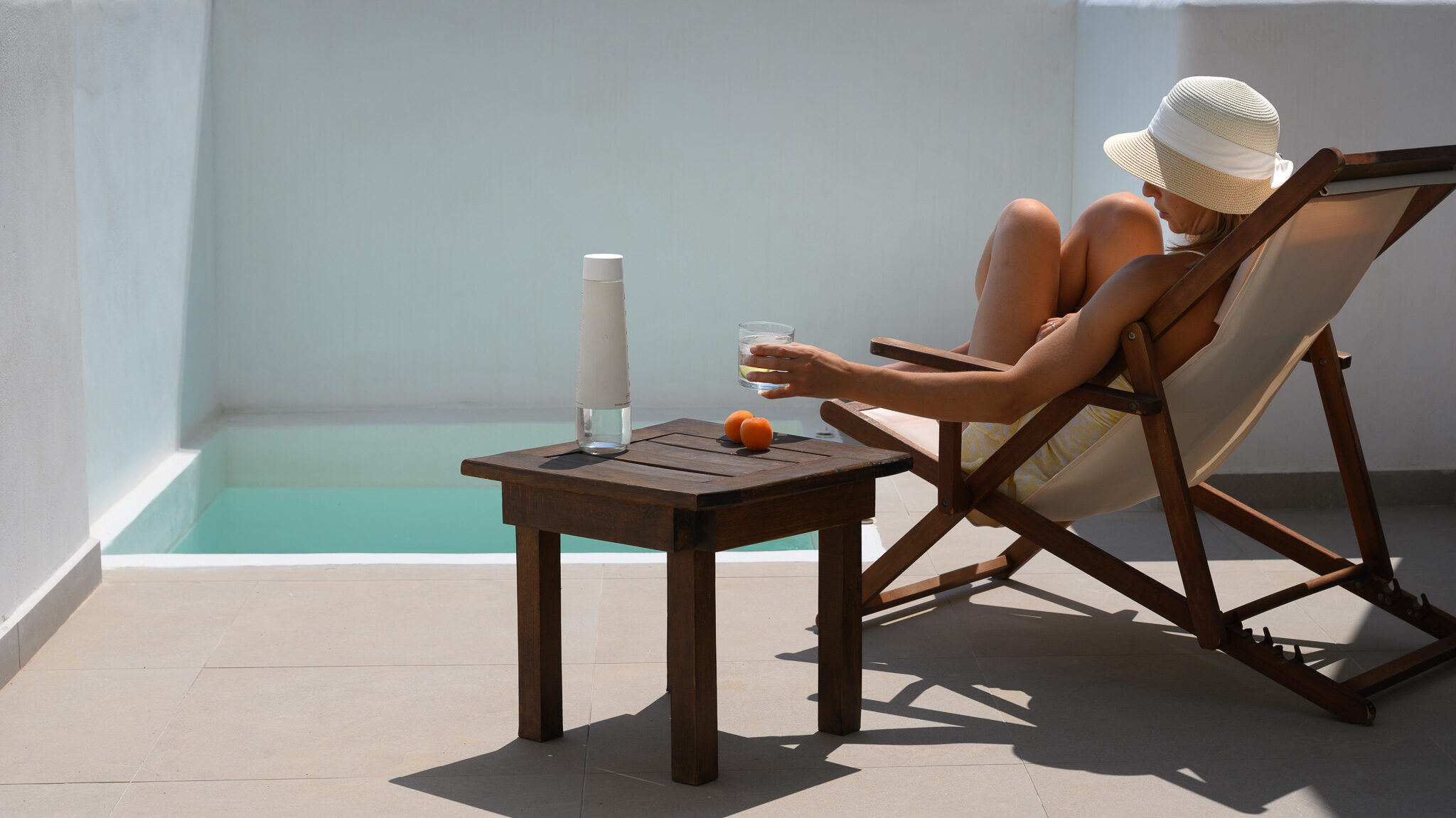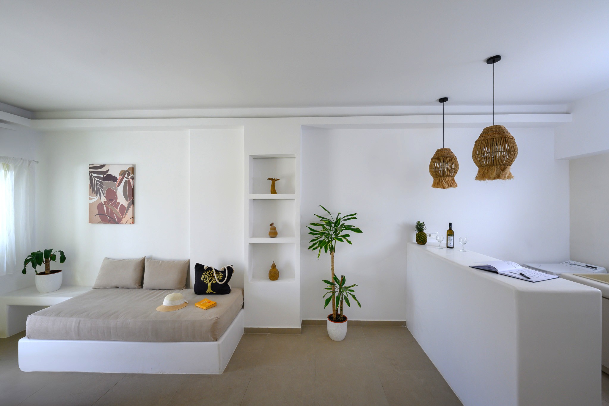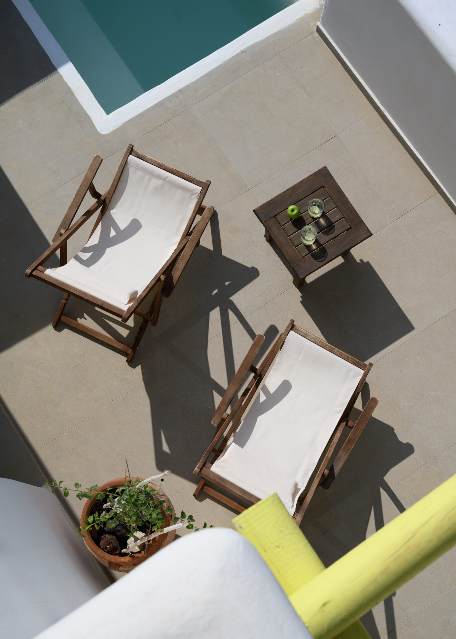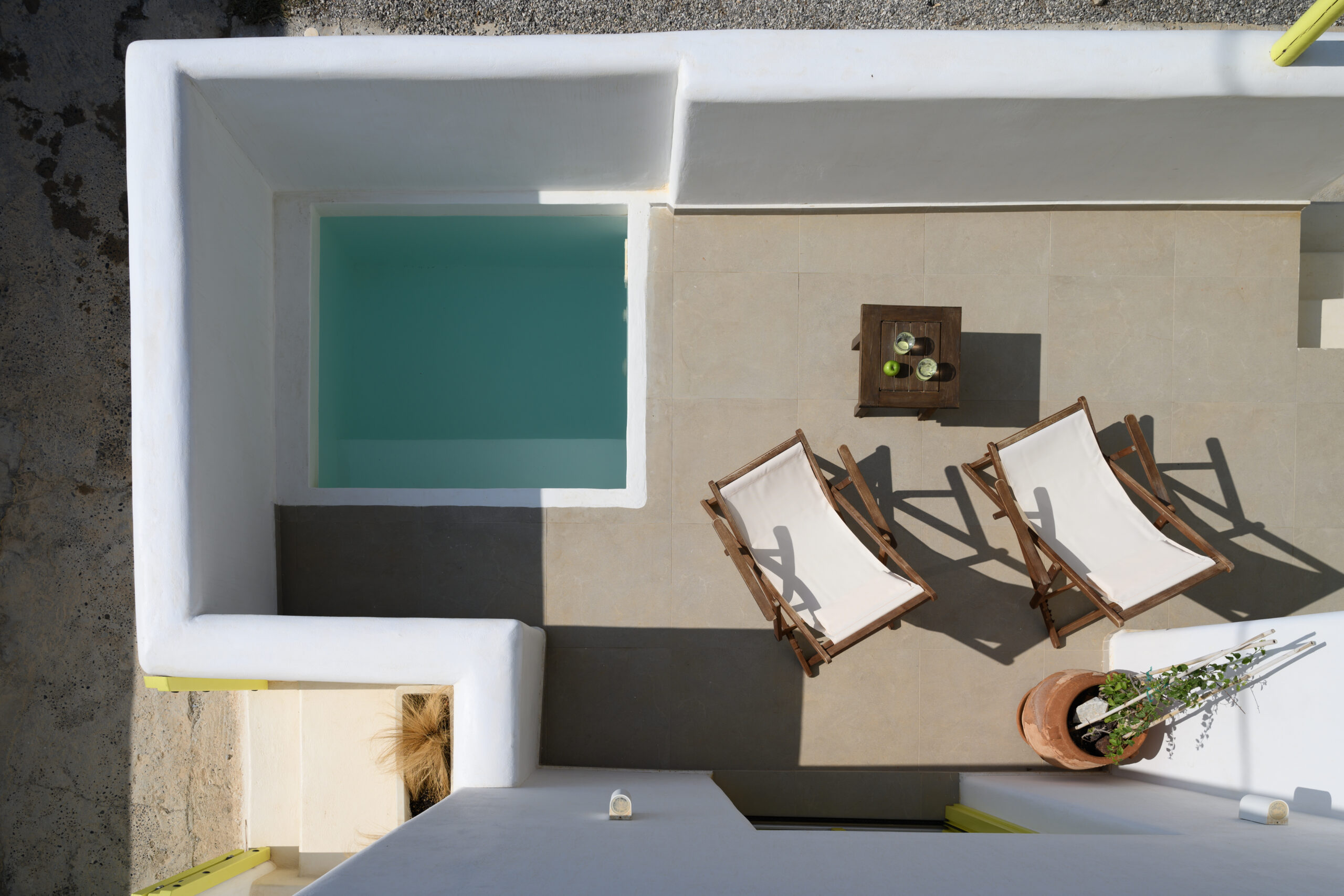 The private outdoor area becomes a personal haven of relaxation, featuring an outdoor refreshing whirlpool ideal for slow mornings, sun-drenched afternoons, or tranquil evenings under the Santorini sky. Inside, modern comforts such as air-conditioning, smart TV, and carefully curated amenities are seamlessly integrated, ensuring a stay defined by comfort, simplicity, and effortless elegance.