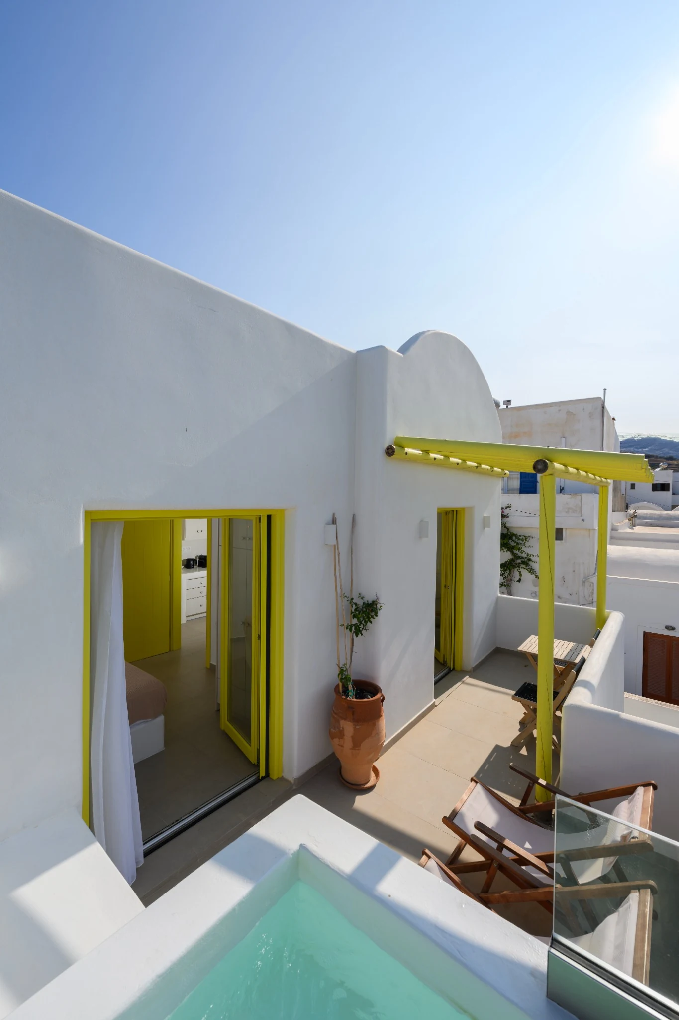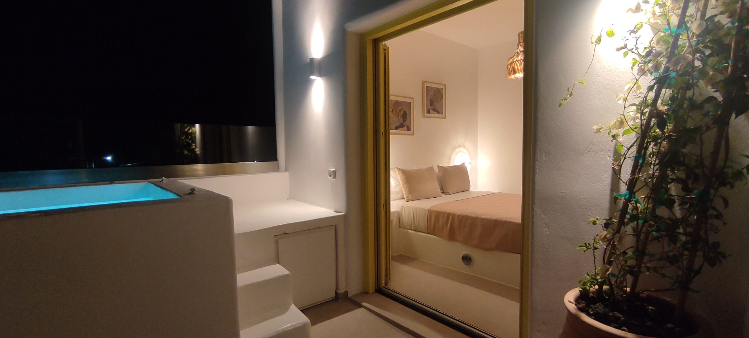 Rooted in traditional Cycladic architecture and located within a traditional settlement, the houses offer a warm, homely ambiance with minimal design, tiled floors, and natural textures. Modern comforts are seamlessly integrated, including air-conditioning, smart TV, , hairdryer, and an outdoor refreshing whirlpool, offering moments of deep relaxation under the open Santorini sky.